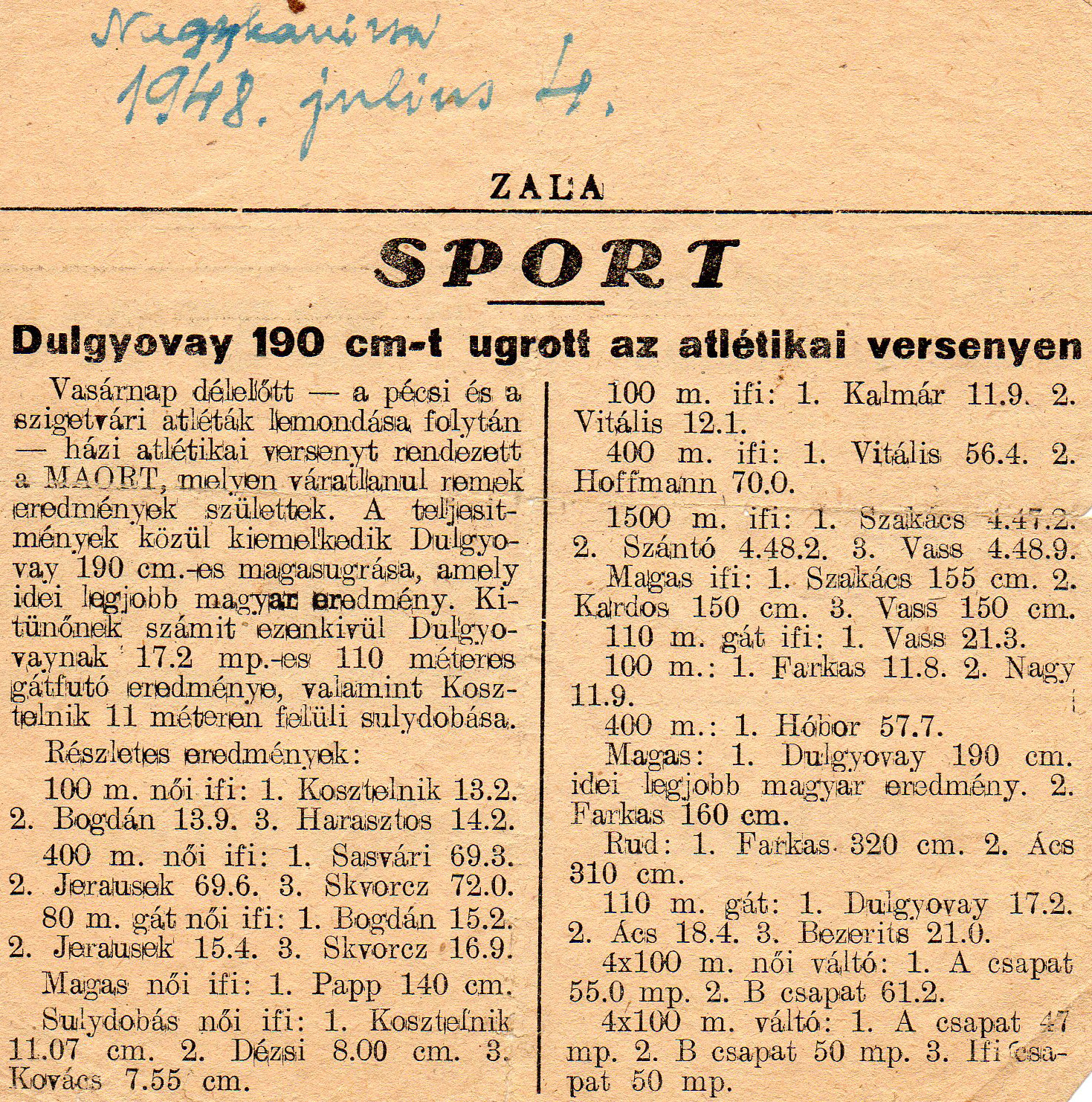 1948: Dulgyovay 190 cm-ert ugrott! Hiradás a ZALA hírlapban.