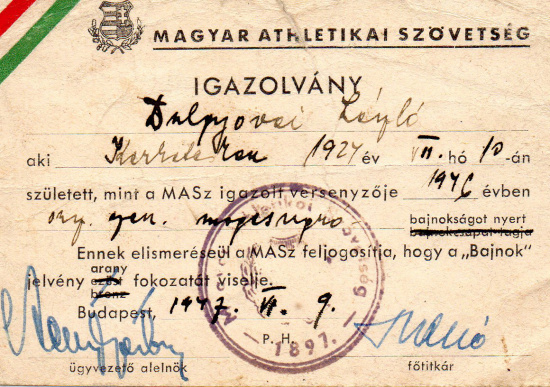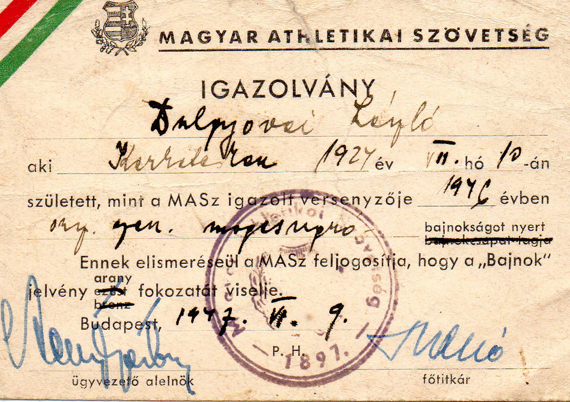 Dulgyovay László versenyigazolványa, amiből megtudjik, hogy 1946-ban a magyar Atlétikai Szövetség "Bajnok arany" fokozatú minősítését bírta.