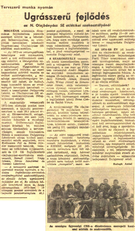 AZ 1974-ES ÉV jól kezdődött az olajosoknál: az országos fedettpályás bajnokságon Parti Tibor aranyérmet szerzett távolugrásban, majd az országos mezei csapatbajnokságon a legfiatalabb fiú-korosztály képviselői álltak fel a dobogó legmagasabb fokára. A legfrissebb sikert pedig az országos ügyességi CSB-n érték el az olajos atléták.