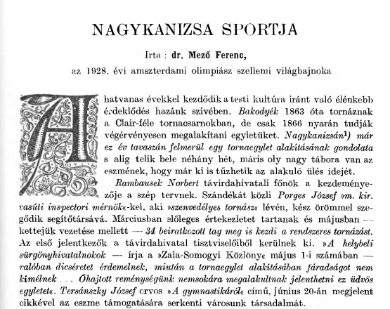 Dr. Mező Ferenc tudósítása az első hivatalos nagykanizsai focimeccsről: "A múlt század végső éveire esik a futbalnak a magyar sportba való bevonulása. A városunkbeli egyetemi ifjúság révén hozzánk is eljut ez a szabadtéri sportág és a Katonarét hovatovább hangos lesz a futbalistáktól. Gruber gimnáziumi tornatanár vezetésével 1903-ban Bogenrieder Frigyes. Gärtner Antal, Golenszky János, Horvát József, Keömives Ferenc, Jaeger István, Mannheim, Sugár, Sallér Aladár már csapatba is verődnek, de egyletet még nem alakítanak. Az első nyilvános mérkőzés csak jóval későbben, 1910 augusztus 27-én kerül bemutatóra. Az ekkortájt alakult Ifjúságképző Sport Egylet (később Ifjúsági Kör Sport Egylete a neve) a kereskedelmisták csapatával méri össze az erejét. Dr.Mező Ferenc vezette a Katonaréten, mintegy 500 főnyi előkelő közönség előtt lefolyt mérkőzést, amely 2 : 2 arányban eldöntetlenül végződött. A két csapat felállítása ez volt: