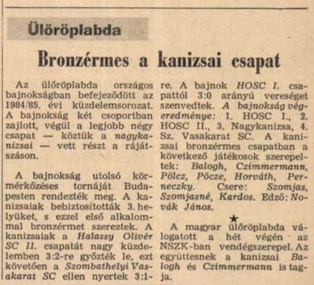 Az ülőröplabda országos bajnokságban befejeződött az 1984/85. évi küzdelemsorozat. A bajnokság két csoportban zajlott, végül a legjobb négy csapat — köztük a nagykanizsai — vett részt a rájátszáson. A bajnokság utolsó körmérkőzéses tornáját Budapesten rendezték meg. A kanizsaiak bebiztosították 3. helyüket, s ezzel első alkalommal bronzérmet szereztek. A kanizsaiak a Halassy Olivér SC II. csapatát nagy küzdelemben 3:2-re győzték le, ezt követően a Szombathelyi Vasakarat SC ellen nyertek 3:1-re. A bajnok HOSC I. csapattól 3:0 arányú vereséget szenvedtek. A bajnokság végeredménye: 1. HOSC I., 2. HOSC II., 3. Nagykanizsa, 4. Sz. Vasakarat SC. A kanizsai bronzérmes csapatban a következő játékosok szerepeltek: Balogh, Czimmermann, Pölcz, Pőcze, Horváth, Perneczky. Csere: Szomjas, Szomjasné, Kardos. Edző: Novák János.