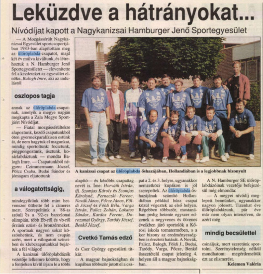 — Igen, 1994-ben az ő tiszteletükre rendezzük meg a „Kanizsa" Nemzetközi Ülőröplabdatornát, melyre rangos csapatokat szeretnénk meghívni. Ennek létrejöttéhez keresünk és reméljük találunk támogatókat. Itt szeretnénk köszönetet mondani eddigi segítségükért, Kanizsa városának, a Nagykanizsai Sörgyárt Rt-nek, Bicsák Miklósnak, Martinecz Antalnak.