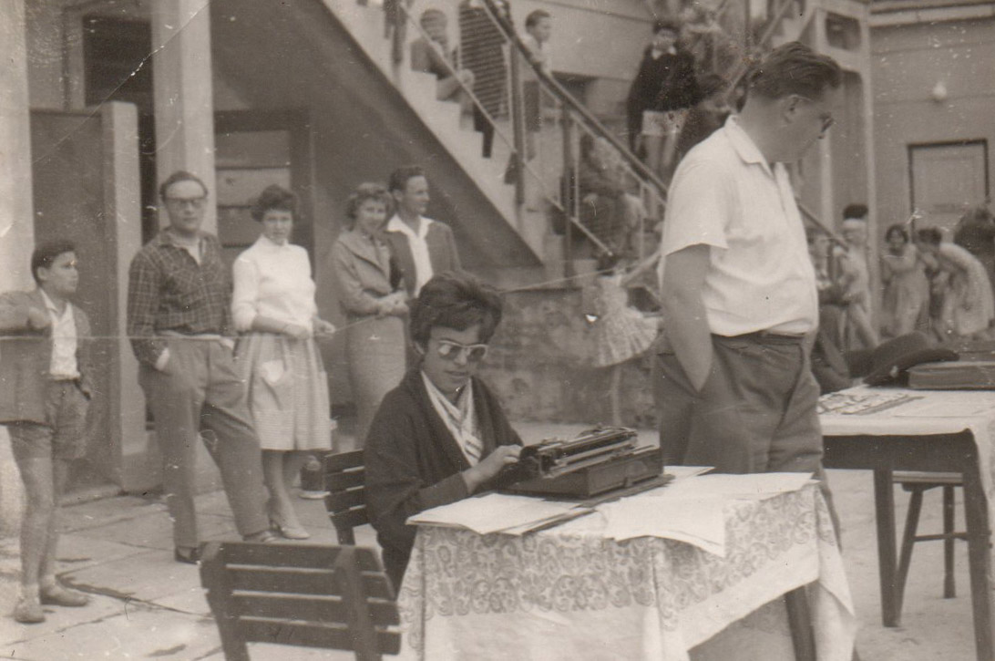 az adományó Wéberné Mohácsy Erzsébet mint gyors és gépíró mögötte szemüvegben látható a képen Csík Ferenc